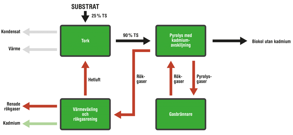 Ingående substrat är ett avvattnat slam med en TS-halt mellan 20 och 30%. Om det avvattnade och rötade slammet har en TS-halt på 25% eller mer räcker dess energiinnehåll till att driva både pyrolys och torkning. Om torkningen görs med ångtork kan >80% av tillförd torkenergi återvinnas.